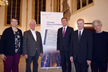 „Wenn wir in unseren Tagen Klagen hören über sich immer schneller entwickelnde bedrohlich erscheinende Veränderungen in Politik, Wirtschaft, Kultur und auch der Religion, dann verblasst dies ziemlich schnell, sobald man sich mit den Lebensverhältnissen in den beiden ersten Jahrzehnten des 19. Jahrhunderts befasst“, führte Referent Prof. Jürgen Kampmann (Ev. Fakultät der Universität Tübingen) anschließend in seinem Festvortrag aus. Anschaulich und detailgenau stellte der Kirchenhistoriker die Ziele und Probleme beim Aufbau der kirchlichen Leitung und Verwaltung in der neuen preußischen Provinz Westfalen dar. Anfangs prägten Ereignisse wie die Napoleonische Zeit, die Befreiungskriege und das sog. „Jahr ohne Sommer“ 1816 die Menschen, gepaart mit einem absolutistischen Staatsverhältnis. Siegesfreude, Existenzangst und Trauer folgten in kurzen, abrupten Wechseln aufeinander. Sie berührten den Alltag, aber auch das kirchliche Leben. 1815 wird die Provinz Westfalen eingeführt, die Oberprovinz wird Münster. Auf Anregung des Oberpräsidenten Ludwig Freiherr von Vincke wird am 22. Dezember 1815 nach einigen Wirren eine Präseswahl für Tecklenburg-Oberlingen initiiert, die „gründlich schief läuft“. Bei einem erneuten Anlauf wird Pfarrer Ernst Werlemann aus Wersen mit Wirkung vom 1. Februar 1816 zum Superintendenten gewählt. Am 1. Juli 1817 werden 36 Landkreise und die kreisfreie Stadt Münster geschaffen. Wie in der staatlichen Provinzverwaltung sollten auch für das evangelische Kirchenwesen in der Provinz solche Ebenen zwischen den Kirchengemeinden und dem Konsistorium eingerichtet werden. Für den Bereich der Grafschaft Tecklenburg und die Gemeinden in Oberlingen (Ibbenbüren, Mettingen, Recke und Brochterbeck) war das nichts Neues. Regelmäßig wurden zuvor bereits jährlich bis 1807 Visitationen in allen Kirchengemeinden durchgeführt.