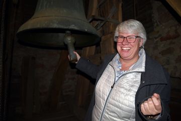 Danach wurde es spannend. Die Führerin öffnete ein Türchen hoch oben an der Rückseite des Kirchenschiffs und zog eine Leiter herunter. War diese überwunden, folgten eine enge Wendeltreppe aus Stein und weitere Stufen aus Holz, die in den Turm bis zum Glockenstuhl hinauf führen. Dort hängen drei Glocken. Die älteste ist die Abendmahlglocke. Sie stammt aus dem 17. Jahrhundert und hatte als einzige den Großbrand von 1681 überstanden. Als Inschrift trägt sie die Namen des damaligen Pastors, Vogts und Glockengießers. Wie in vielen anderen Gemeinden, wurden auch in Recke die Glocken im zweiten Weltkrieg konfisziert, höchstwahrscheinlich eingeschmolzen und zu Waffen verarbeitet. Alle drei Glocken sind in Betrieb – bei vollem Geläut versetzten sie das Gebälk in Schwingung. Der Turm ist in der ersten Hälfte des 13. Jahrhunderts entstanden, auch bei dem Rundgang über dem Gewölbe waren alte Balken gut zu erkennen. Die Turmuhr hat leider die Umstellung auf Winterzeit nicht gut überstanden und muss repariert werden.
