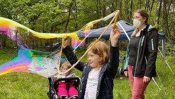 Als solche waren Taube, Feuer und Wind auch während der Familienaktion spielerisch zu entdecken. An einem knisternden Lagerfeuer entstanden mittels Salatschleudern bunte Farb“feuer“werke, riesige Seifenblasen waberten, vom Wind getragen, sanft über eine Waldwiese, und aus einfachen Ausmalkarten wurden mit Geduld und Fantasie beeindruckende kleine Kunstwerke. Zum Abschluss konnten sich Eltern und Kinder vor dem bunten Pfingstfenster in der Johanneskirche fotografieren lassen und ihr Bild anschließend direkt mit nach Hause nehmen. „Pfingsten to go“, schmunzeln Jana und Lena Stöppel, die diese Station betreuten.