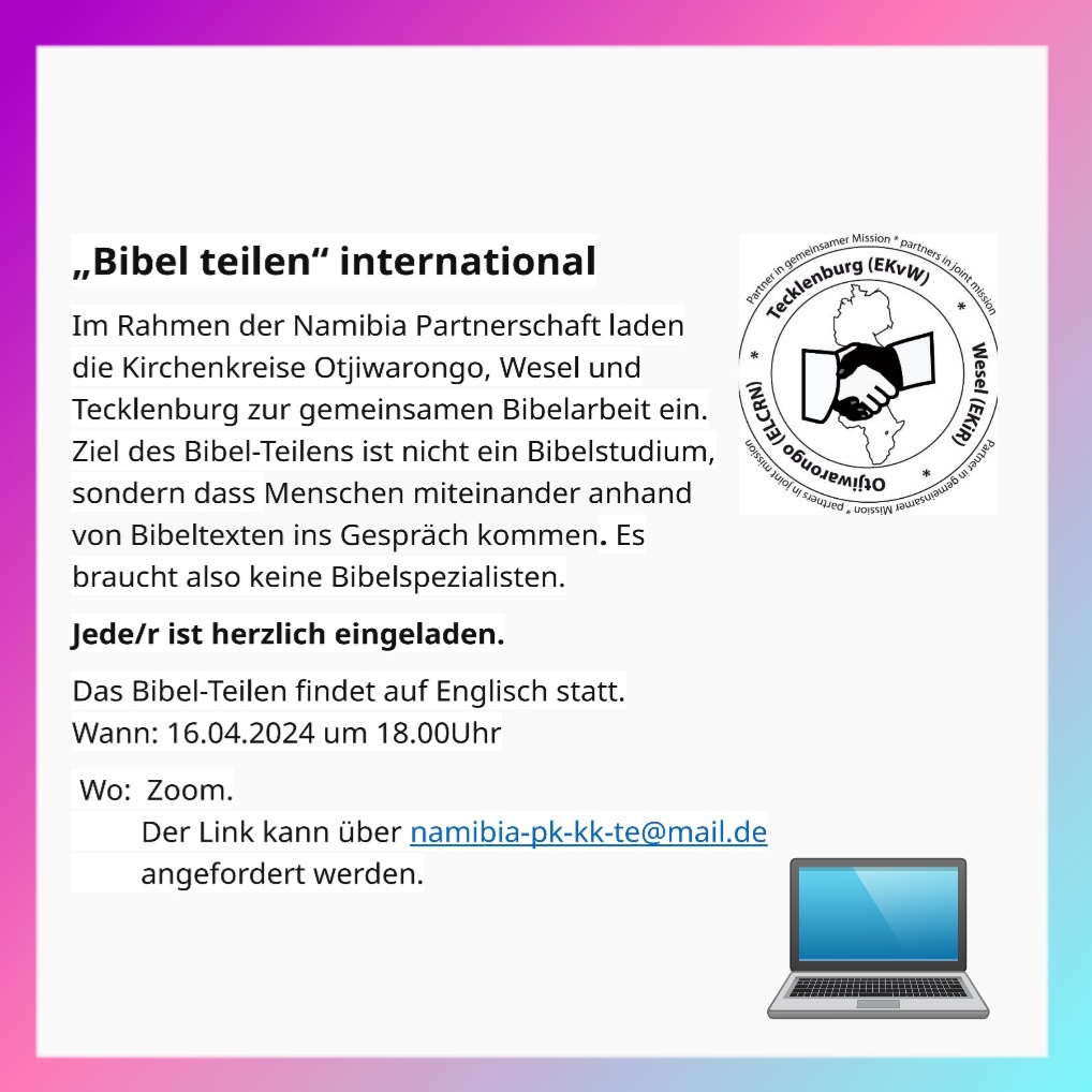 Ziel des Bibel teilens ist nicht ein Bibelstudium, sondern dass Menschen anhand von Bibeltexten miteinander ins Gespräch kommen. Es braucht also keine Bibelexperten.