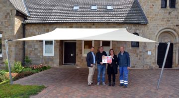 Die Vorarbeiten erledigten Ehrenamtliche der evangelischen Gemeinde. Einige von ihnen halfen auch beim Aufbau. Beim Kirchcafé nach dem Gottesdienst, bei besonderen Veranstaltungen, und auch am Familiensonntagnachmittag vor den Sommerferien kann das Segel jetzt eingesetzt werden. „Das Besondere an dem Sonnensegel ist, dass wir es ab dem nächsten Jahr auch für die Terrasse an der Alten Schule verwenden können“, sagt Pfarrerin Dorothea Pfuhl. Darüber freuen sich die Gruppen und Kreise, die im Sommer die Terrasse und den großen Garten hinter der Alten Schule nutzen. Der Kirchenchor weihte das Sonnensegel gleich ein. Beim Sommerfest genossen die Sängerinnen und Sänger das erste Glas Wein unter dem schattenspendenden Segel.