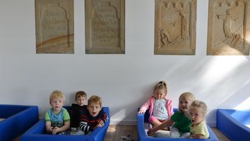 Martin Oelrichs Lieblingsraum ist der Schlafraum für die Jüngsten. Die Betten stehen unter Sandsteintafeln mit biblischen Motiven und Texten. „Die Kleinen schlafen sozusagen unter Gottes Schutz“, sagt er schmunzelnd. Er freut sich, dass die Tafeln, die früher versteckt im Saal hingen, jetzt gut zur Geltung kommen.