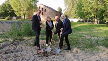 Hatten die vier aufgrund des durch die Trockenheit hart gewordenen Bodens auch einige Kraft aufzuwenden, um den Spaten in die Erde zu rammen, ließen sie sich die Freude doch nicht verderben. Die inzwischen angerollten Bagger haben da ein leichteres Spiel… Auch der Baustrom ist gelegt, sodass einem zügigen Vorankommen nichts im Wege steht. Zuvor hatte ein Bombenfund den Baubeginn verzögert. „Wir freuen uns, dass es nun losgeht und sind sehr gespannt auf die Bauphase", so Superintendent Schlien, der gleichzeitig derzeitiger Verbandsvorsitzender der gemeinsamen Verwaltung ist. Wenn alles glatt läuft, soll das Gebäude im August 2020 fertig sein. Der Einzug der Mitarbeitenden aller drei Kirchenkreise ist für den September 2020 geplant.