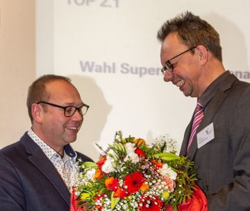 Unter großem Applaus nahm der frisch gewählte Superintendent die Gratulation des stellvertretenden Superintendenten Thomas Groll entgegen und dankte für das entgegengebrachte Vertrauen.
