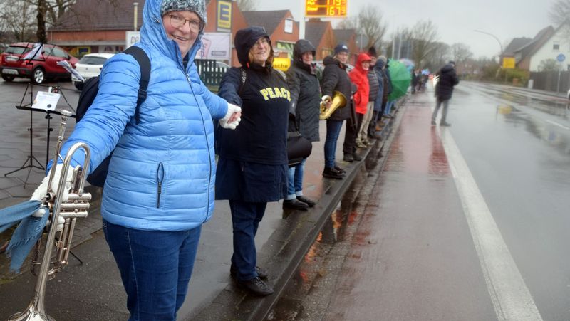 „Frieden lasse ich euch, meinen Frieden gebe ich euch. Nicht gebe ich euch, wie die Welt gibt. Euer Herz erschrecke nicht und fürchte sich nicht“, zitierte Dörthe Philipps Verse aus dem Johannes-Evangelium im Neuen Testament. Gott möge die Menschen verändern, genauso wie er die Welt verändern könne, so die Pfarrerin weiter. Trotz durchdringendem nasskaltem Dauerregen versammelten sich auf der halben Wegstrecke zwischen Münster und Osnabrück viele Menschen in Ladbergen, um ihre Stimme für ein friedliches Miteinander zu erheben. Superintendent André Ost war in Ladbergen vor Ort und berichtete, dass er an die 17 Kirchengemeinden des Kirchenkreises appelliert habe, sich an der Friedenskette zu beteiligen: “Mit unserer Teilnahme an der Friedenskette können wir deutlich machen, dass jede Mühe um Verständigung lohnt, um Frieden wiederherzustellen und zu bewahren.“ André Ost sprach ein Gebet für die unter den Kriegsumständen leidenden Menschen in der Ukraine und bat um den Willen zum Frieden unter allen Beteiligten. Der Posaunenchor der Kirchengemeinde lud mit Friedensliedern wie „Herr, gib uns Deinen Frieden“ Und „Gib uns Frieden jeden Tag“ zum Mitsingen ein. Die Glocken der umliegenden Kirchen unterstrichen diese Friedensbotschaft mit ihrem Läuten.