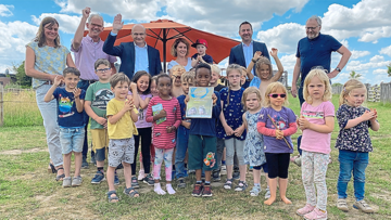 Die Urkunde für den 1. Platz überbrachte Landrat Dr. Martin Sommer höchstpersönlich. „Euer Projekt hat uns total begeistert“, erklärte der Landrat den Jungen und Mädchen. „Ich glaube, viel mehr Menschen müssten sich so für das Klima und die Natur einsetzen, wie ihr es tut.“ Im Regenbogenland habe jede Kita-Gruppe ein eigenes Gemüsebeet, sagte der Landrat. So könnten die Kinder früh lernen, wo das Essen herkomme, wie Gemüse und Obst wachse. Im Herbst ernte das Familienzentrum Obst von einer kleinen Streuobstwiese. Zudem biete das naturnah angelegte Areal viel Platz für zahlreiche Tiere wie Käfer und Insekten.