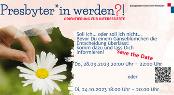 Unter dem Motto: „Presbyter*in werden: Soll ich..., oder soll ich nicht…“ bekommen potenzielle neue Presbyter*innen die Möglichkeit, sich transparent und motivierend zugleich mit dem Thema zu beschäftigen.