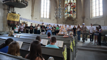 In der Kirche wurden verschiedene Infostände im Rahmen eine Stationslaufes aufgebaut. Hierbei wurde auch auf die Altersdifferenzierung geachtet. So gab es ein begleitetes Lese-Angebot für Kinder mit Kinderbüchern zum Thema Flucht im Altarraum und eine biblische Meditation zu Psalm 69 über Flucht und Seenotrettung für Jugendliche und junge Erwachsene auf der Empore. Durch das breitgefächerte und anschauliche Material des Vereins United4Rescue konnte jede*r sich über zivile Seenotrettung informieren.