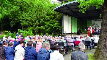 Eindrucksvoll war, dass Menschen aus unterschiedlichen Ländern in ihrer Muttersprache einen Friedensgruß an die Gemeinde richteten. Grüße z.B. aus Bolivien, Portugal, dem Libanon, der Türkei, aus den Niederlanden, Sri Lanka und Indien wurden vorgetragen, um zu zeigen, dass die Friedenshoffnung alle Menschen eint – egal aus welchem Land sie stammen oder welcher Religion sie angehören. Dies betonte auch Pfarrer Dirk Schinkel in seiner Predigt und fügte hinzu, wie wichtig es sei, dass alle, die den Frieden wollen, gemeinsam handeln und sich verbünden. Er schloss mit einem Zitat von Willy Brandt: „Frieden ist nicht alles, aber ohne Frieden ist alles nichts.“ Pastor Heinz Mackel stellte schon in seiner Begrüßung den Zusammenhang zwischen Pfingsten und dem Wunsch nach Frieden her: Der Heilige Geist sei immer ein Geist des Friedens und der Liebe. Der Gottesdienst wurde musikalisch von Alla Brukwin (Klavier), Peter Ricken (Geige) und einer Frauen-Schola (Gesang) gestaltet. Der große Applaus am Schluss zeigte, wie sehr sich alle wieder freuten, dass diese gute Tradition, sich im Stadtpark zu Pfingsten zu versammeln, nun fortgesetzt werden konnte.