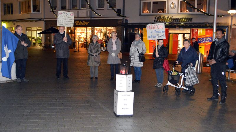 „Jeder Mensch ist wichtig und hat gleiche Rechte und Pflichten“, meint Reinhard Paul, evangelischer Pfarrer im Ruhestand. Er ist einer von zumeist 20 bis 30 Teilnehmern der Aktion, die auf diese Weise ihr Mitgefühl für Flüchtlinge zeigen und ein Zeichen setzen wollen gegen Hass, Gewalt, Terror und Krieg. „Schweigen für den Frieden heißt nicht, tatenlos zu sein“, erklärt Paul. So gebe die Aktion selbst, mit einem Licht in der Mitte als Konzentrationspunkt, Raum für Gedanken und Meditation oder ein Gebet. Darüber hinaus sind viele der Männer und Frauen in der Flüchtlingshilfe aktiv. Mittlerweile kommen auch einige Flüchtlinge, um an der Aktion teilzunehmen.