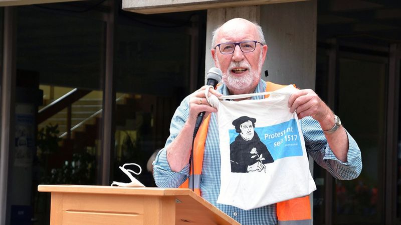 Pfarrer i. R. Reinhard Paul von der evangelischen Kirchengemeinde Ibbenbüren freute sich, dass auch die Kirchen Platz in der Initiative haben, denn sie sind an vielen Stellen in deren Aktivitäten eingebunden, beispielsweise in den „Cafés International“ oder im Arbeitskreis Asyl. „Wir wissen, dass Tausende auf der Flucht im Mittelmeer ertrunken sind, wir kennen die Bilder“, mahnte er. Trotzdem lasse sich die Mehrzahl der Menschen nicht dazu bewegen, diesem Elend ein Ende zu bereiten. Die Europäische Union sollte im Eingeständnis ihrer Handlungsunfähigkeit und Ohnmacht den 2012 verliehenen Friedensnobelpreis zurückgeben, schlussfolgerte Reinhard Paul. Es müsse einfach mehr getan werden. Er selbst finde das Geheimnis, dass Menschen sich mit Verstand und Herz bewegen, in der Gestalt des Menschensohnes Jesus, sagte der Pfarrer. Er erklärte den Zuhörern, dass es im Christentum, Islam und Judentum gleichermaßen heißt: „Wer einen Menschen rettet, der rettet die Welt“. Er dankte den Seebrücke-Aktivisten für ihre Bereitschaft zum Brückenbauen.