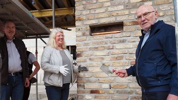 Kaum war der Richtkranz hochgezogen, wurde ihm die Ehre zuteil, beobachtet von rund 40 geladenen Gästen, darunter Superintendent André Ost, Vertreter des Presbyteriums, Frank Lammert als Vertreter des Bürgermeisters sowie Architekt Marc Hehn, mit einem dicken Hammer den letzten Nagel in das Dachgebälk zu treiben.
