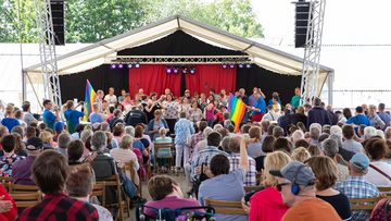 Entspannt genießen lassen sich das kulinarische Angebot und das Bühnenprogramm unterm Riesenfallschirm, dem großen Paragu. Ganztägig auf der Bühne zu sehen und hören: die Infos zum Thema Außenarbeit, die Verlosung der Sozialraum-Rallye und LeWe-Gruppen, die inklusiv Musik machen und tanzen.