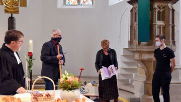 Die Konfirmanden Julian Schwarz und Max Jaufmann trugen die Lesung aus dem achten Kapitel des Markusevangeliums über die Speisung der 4000 vor. Den Psalm 138 sprach die Gemeinde in der gut besuchten Kirche gemeinsam. „Wir wollen Gott danken für das, was in seiner Schöpfung an Schönem und Lebendigem, an Befreiendem und Ermutigendem hervorgebracht worden ist“, sagte Reinhard Lohmeyer.