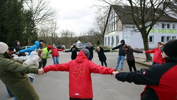 Die morgendlichen theologischen Impulse, z.B. zur Geschichte der Sturmstillung dienten in Verbindung mit der Übung „Jurtekreis“ (siehe Foto) als typisches Element der Erlebnispädagogik und wurden den 17 Teilnehmer*innen praxisnah draußen unter blauen Himmeln erfahrbar gemacht. Auch konnten so erste Beispiele für möglicher Reflexionstechniken thematisiert werden, die gut zu dem stürmischen Wochenende passten: „Wo kannst du dich fallen lassen, wo wirst du gehalten und wo gibst du Anderen Halt“? So ließen sich die Teilnehmer*innen vertrauensvoll und motiviert auf persönliche und kollektive Methoden und Übungen ein, um im Mai für das zweite Ausbildungsmodul von insgesamt fünf Modulen wieder zusammen zu kommen.