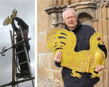 "Der hat schon einiges mitgemacht", sagt Kirchbaumeister Wolfgang Echterhoff beim Blick auf den Blechvogel, der vor einigen Tagen von seinem Platz in rund 45 Metern Höhe geholt wurde.