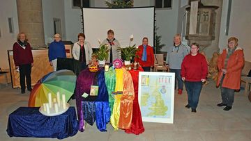 Das Bild zum Weltgebetstag 2022 mit dem Titel “I Know the Plans I Have for You” stammt von der Künstlerin Angie Fox. Dem Thema entsprechend wählte sie Friedenssymbole wie die Taube und eine Lilie sowie den Regenbogen für die alles überstrahlende Liebe Gottes. Das Vorbereitungsteam mit Marita Enseling, Mechthild Fislage, Pfarrerin Claudia Raneberg, Pastoralreferentin i. R. Gabriele Hecker, Mechthild Wauch-Kubitscheck, Petra Thalmann, Pastoralreferentin Nicole Küdde und Brigitte Remke hatte den Altar der Christuskirche geschmückt. Dabei stand der Regenbogen im Mittelpunkt. Die anwesenden Gemeindemitglieder wurden mit einer Tüte „Weltgebetstag to go“ überrascht, in der neben dem Text der Liturgie auch landestypische Erzeugnisse und Rezepte steckten. Die musikalische Gestaltung des Treffens übernahm Gudrun Schwager. Sie studierte mit den Teilnehmerinnen die Lieder ein.
